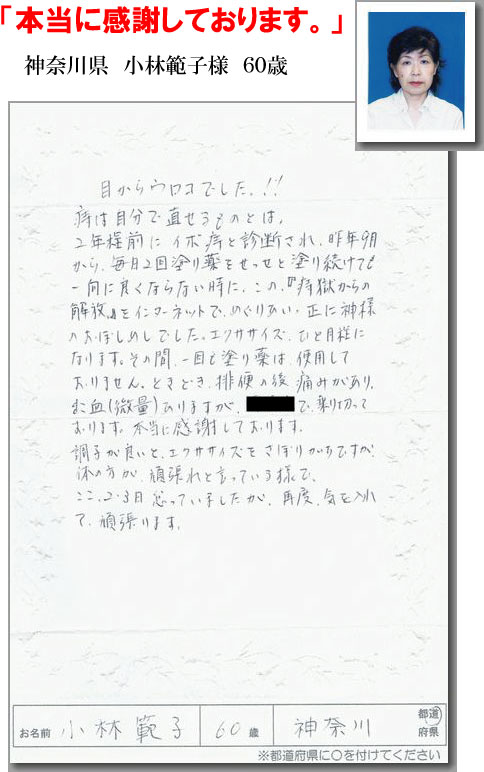 | ≪ 「1週間入院だと言われました!」 | | HOME | | 「痔の痛みがなくなりました!」 ≫ |
